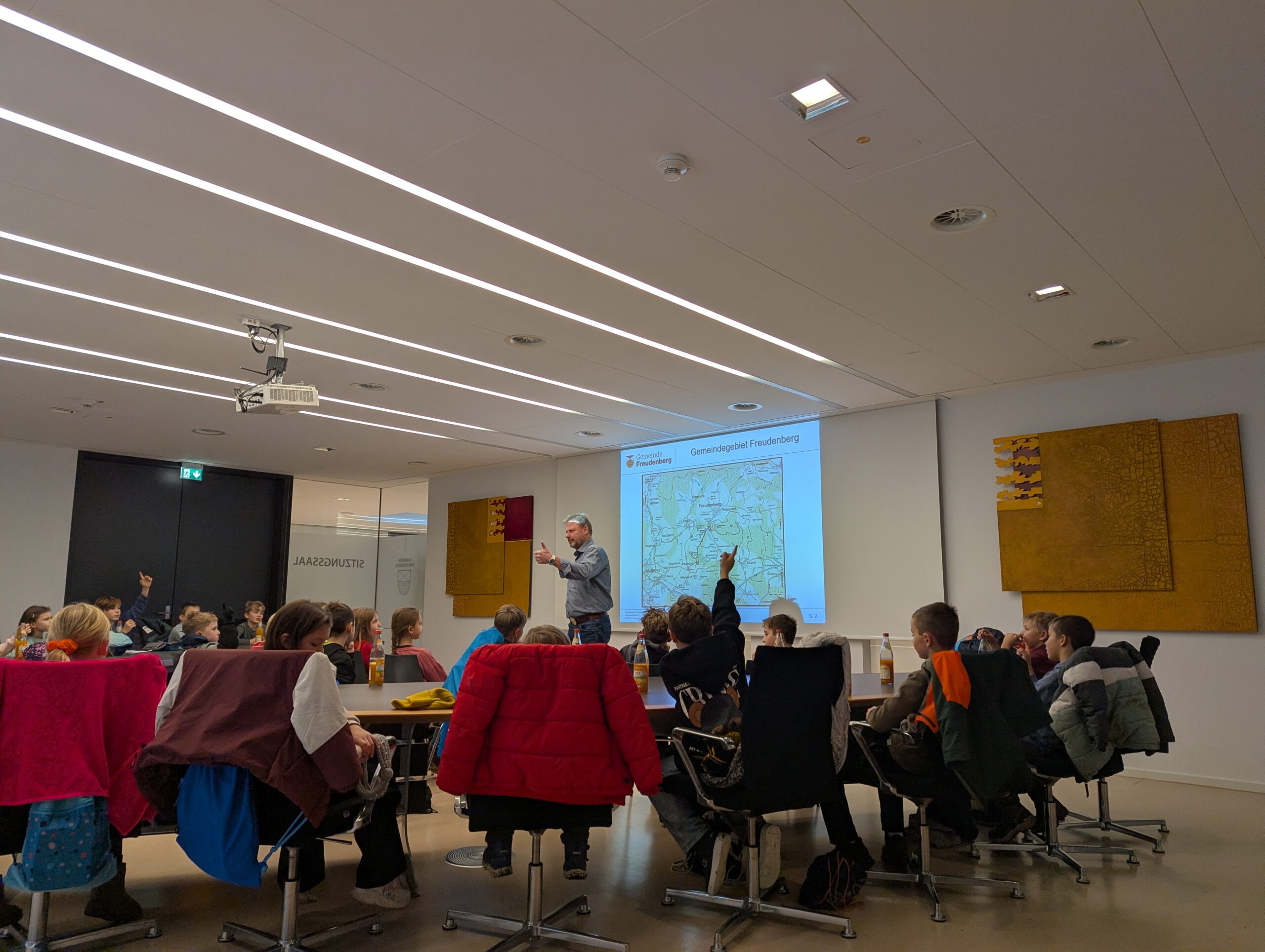 Bürgermeister Alwin Märkl hieß die Kinder herzlich willkommen und öffnete für sie den Sitzungssaal. Auf den Plätzen der Gemeinderätinnen und Gemeinderäte zu sitzen, war ein ganz besonderes Erlebnis.
